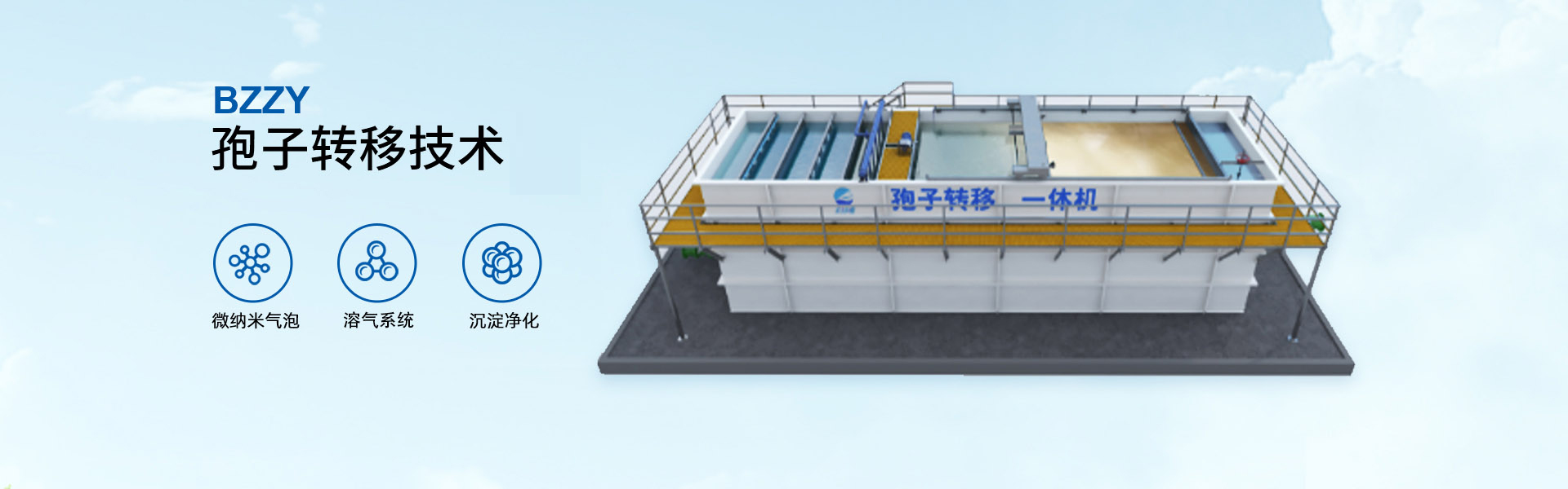 孢子轉移系統主要包括設備主體、孢子發生系統、加藥系統、浮渣收集及排污系統、沉泥抽吸及排污系統、自控系統等。孢子發生系統產生的微納米氣泡具有巨大的比表面積,通過釋放過程中產生的超強攪拌作用,與進水和定制化藥劑在設備主體中發生反應,形成的浮渣經過刮渣機刮除,沉泥經過底部吸泥機清除。通過物理、化學等學科的交叉應用,有效去除水中的總磷、懸浮物等污染物,同時實現水體復氧。